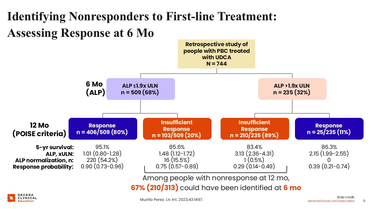A retrospective study of people with PBC who were treated with UDCA investigated whether earlier assessment of treatment response was better able to identify nonresponders and whether earlier identification of nonresponders led to better outcomes.5