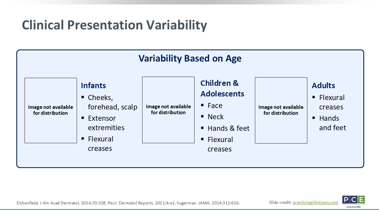 As previously mentioned, AD presentation can change as patients age. In babies, there is a lot of activity on the face. I call it a high traffic area because of all the saliva and drool that is going on. AD also affects the extensor extremities and flexural creases. As children age, AD affects their face, neck, and hands, specifically. It sometimes has activity on feet and flexural creases, rather than the extensor surfaces of extremities. In adults, often AD is seen in their flexural creases and on the hands and feet.11