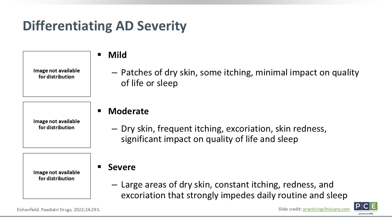 Once HCPs diagnose a patient with AD, they also need to determine disease severity. HCPs must be able to differentiate AD severity. Mild disease includes small, dry patches of skin with some itching and a minimal impact on quality of life or sleep. With moderate disease, patients will have dry skin that is frequently itchy with excoriations, redness, and a significant impact on quality of life and sleep. Then severe disease presents with large areas of dry skin that is constantly itchy with redness and excoriation that strongly impedes patients’ daily routines and sleep.9
