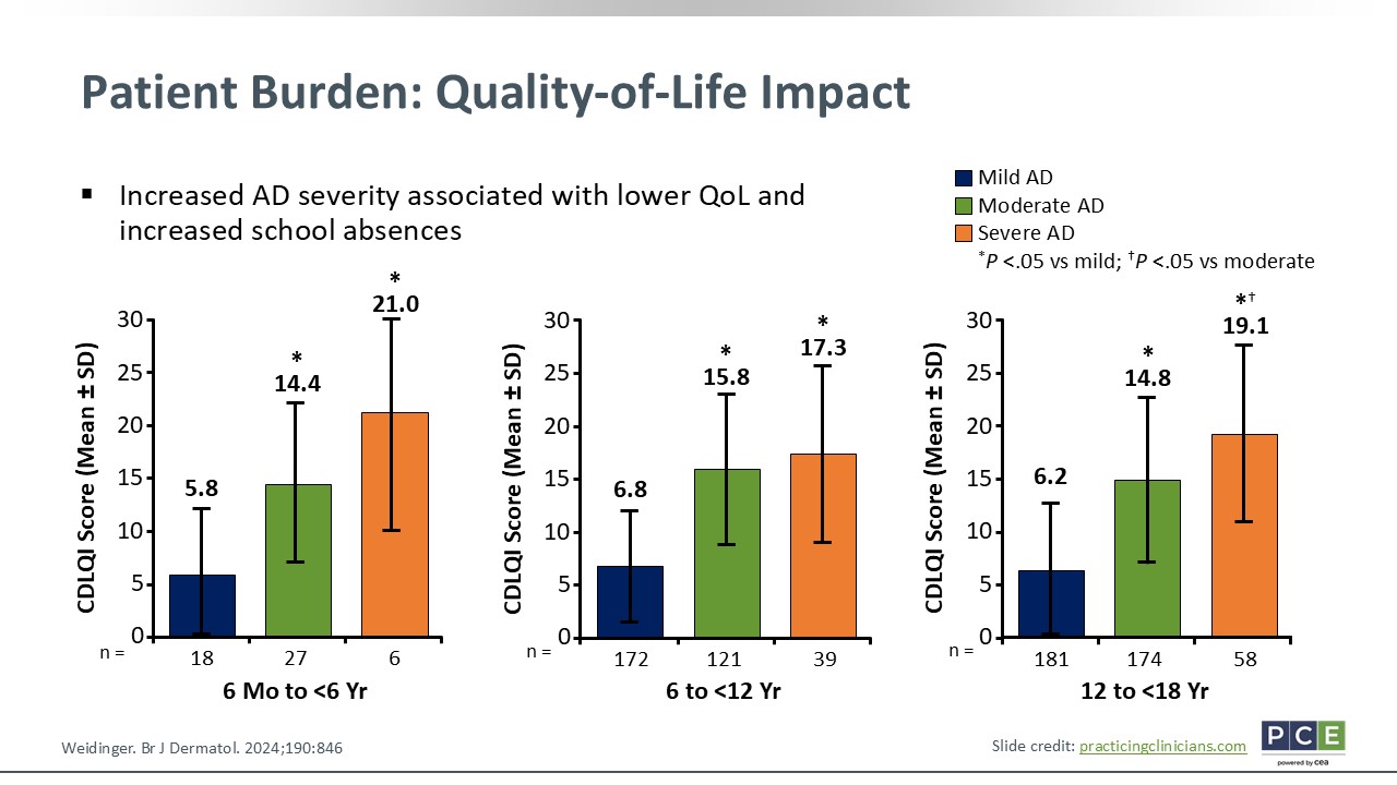 Quality of life often is measured in pediatrics by the Children's Dermatology Life Quality Index. This scale captures the daily impact of AD on school, friendship, self-esteem, and emotional well-being. Across all age groups, the slide shows how quality of life was markedly worse in the patients with mild to moderate AD. Among adolescents and adults with mild disease, their quality of life score was 6.2 compared with 19.1 among those with severe AD. That is more than a threefold increase in how much their lives were affected by AD.