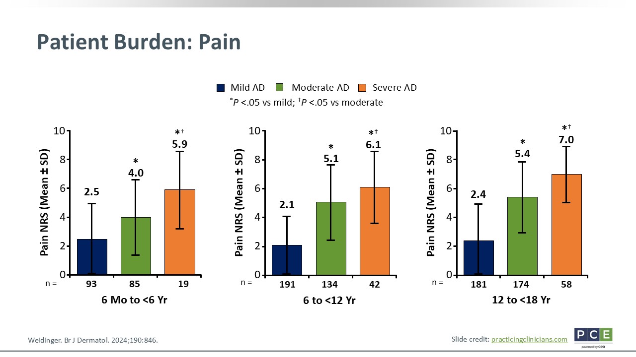 I think a more underrepresented symptom of AD is pain. When discussing itch, researchers have connected this symptom with sleep, but we do not necessarily talk about pain. Pain can stem from excoriated lesions, infections, and nerve sensitization with chronic inflammatory areas. This slide illustrates the burden of pain in AD. Like itch, pain scores increase as disease severity worsens. Adolescents and adults reported a mean score of 7.0 among those with severe AD compared with 2.4 among those with mild disease.4