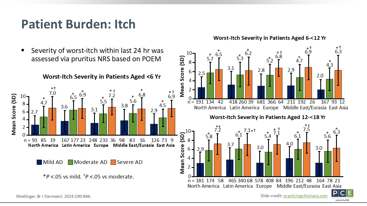 Now, let us look at the different factors of the patient experience measured by the Patient-Oriented Eczema Measure (POEM). Of course, itch is likely the most common burden that we discuss in patient visits, and it is a focus of research. The figure on this slide illustrates the worst-itch within the past 24 hours, stratified by age, geographic location, and disease severity. Across all age groups, symptom scores rose significantly as patients’ disease severity increased. With adolescents and adults specifically, POEM itch-related scores ranged from 6.3-7.5 out of 10.0 for those with severe AD. Furthermore, these graphs reinforce the idea that itch is incredibly burdensome for patients; it is not just a number. It also shows that persistent and disruptive itch affects sleep, quality of life, and patients’ ability to participate in school, sports, and activities—all the things that children love to do.4,7