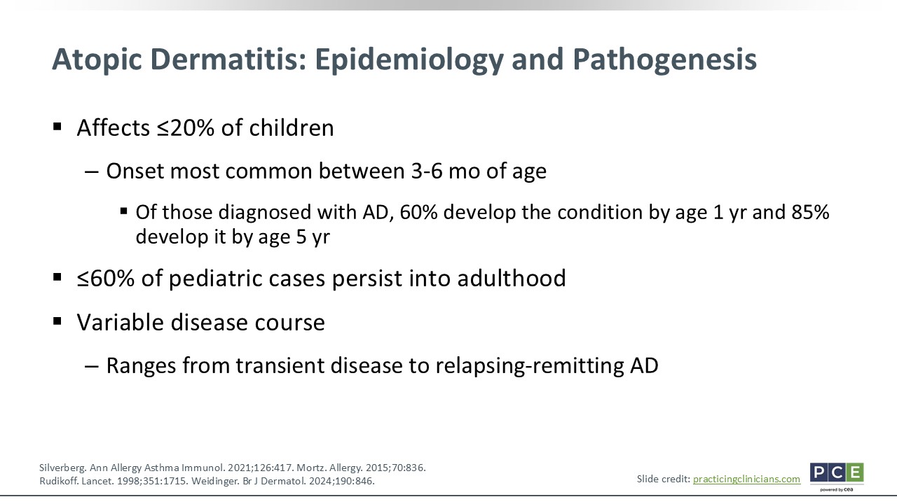 AD affects up to 20% of children. It is one of the most common chronic inflammatory skin disorders we see, and it typically starts in children 3-6 months of age. Furthermore, 60% typically are diagnosed before they turn 1 year of age and 85% are diagnosed by the time they turn 5 years of age. It is an early life disease, with approximately 60% of childhood AD cases persisting into adulthood. Therefore, it is not just a pediatric condition.