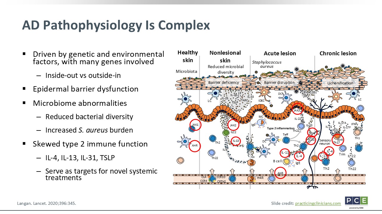 Patients with AD also have impaired stratum corneum, which leads to reduced lipid content in the skin, decreased filaggrin expression, and increased trans epidermal water loss. Thus, creating dry skin and making it more penetrable to the irritants and microbes. In AD, the skin also has a decrease in its microbial diversity. There are increased colonies of disease causing Staphylococcus aureus, too, that tend to flare or become even more prominent during times of flare-ups. Yet the hallmark of AD is the skewed type 2 inflammatory response with those prominent cytokines (IL-4, IL-13, IL-31 and thymic stromal lymphopoietin) being major players. These are the therapeutic targets for new and emerging systemic agents.5,6