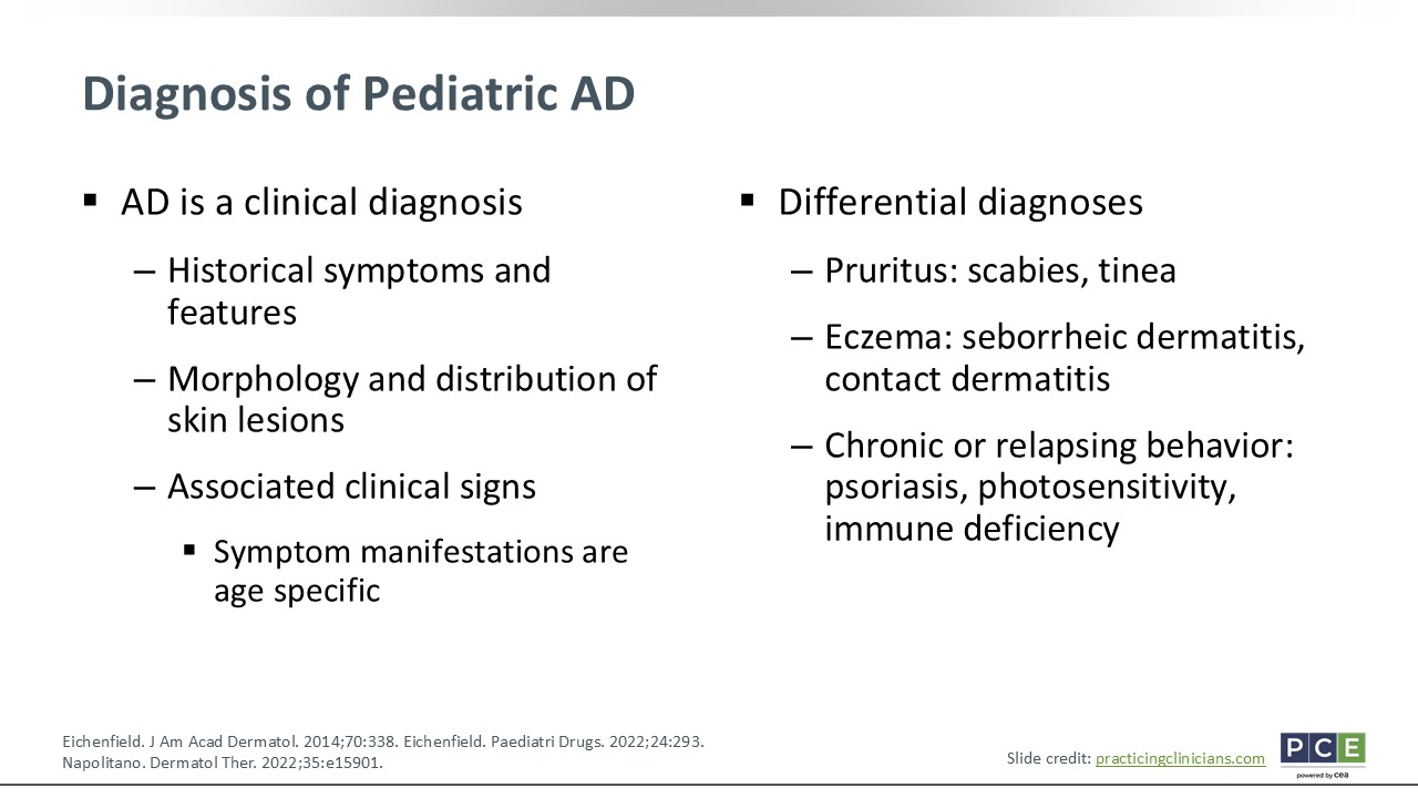 AD requires a clinical diagnosis. There are no specific lab tests and we typically do not biopsy the skin. Rather, HCPs should rely on patients’ history, the recognition of lesion patterns, and common symptoms like itch. Sometimes there is a personal or family history of atopic conditions, and the clinical presentation can differ as patients age.