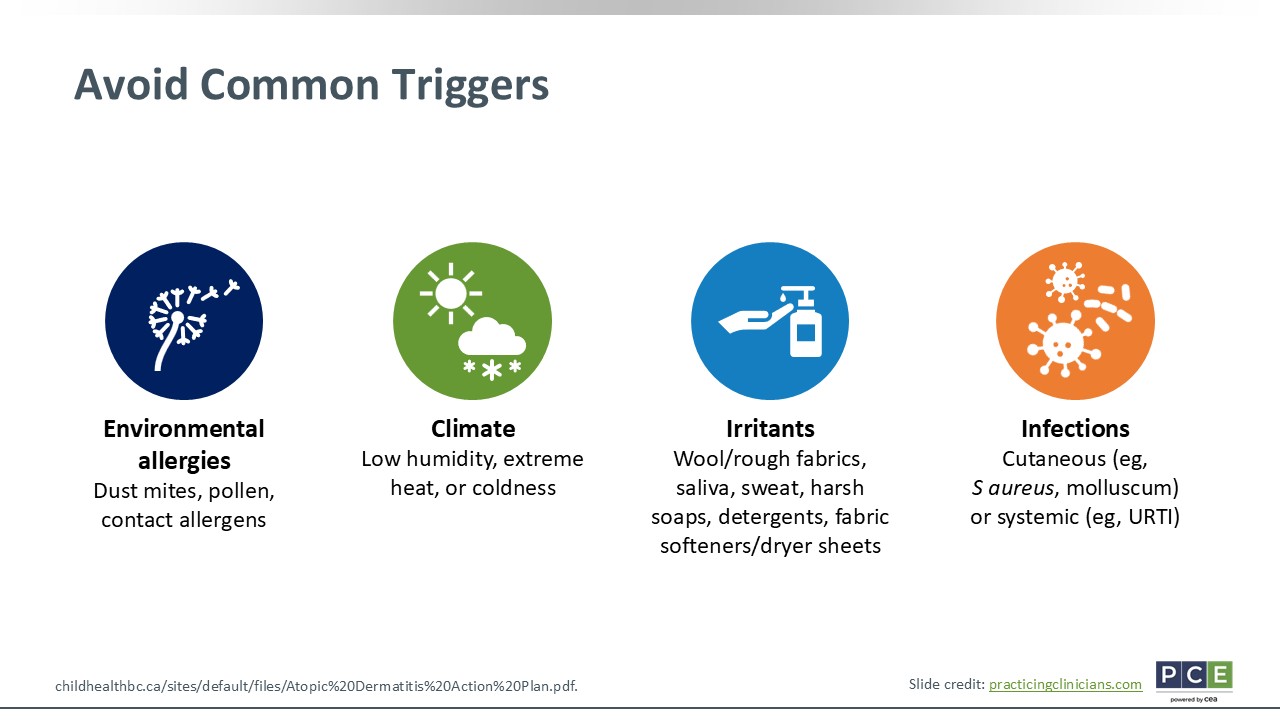 We also discuss irritants. With infants, the high traffic area of their drool and saliva is often a common trigger, so we will try to reduce that exposure using emollients as a barrier. I then talk a lot about their products and detergents, fabric softeners, and dryer sheets that could potentially worsen their AD. I recommend to all my patients with AD that they use fragrance-free, dye-free products. Finally, infections can also drive flare-ups. Both cutaneous infections with S aureus or molluscum and common colds or systemic infections can lead to AD worsening.42