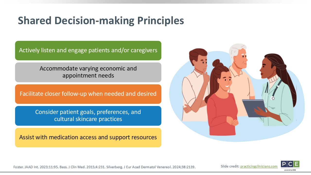 It is important to engage patients and their caregivers in SDM. Work with them to build rapport, which promotes trust, treatment adherence, self-confidence, and management. That will lead to better outcomes. Furthermore, developing patient-specific action plans and individualizing care can help them recognize early flare-ups and help HCPs know when/how to escalate treatment and address any barriers to care.