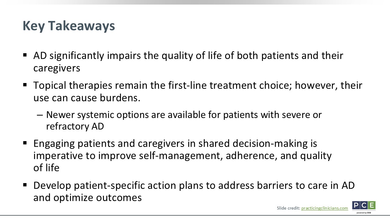 For key takeaways, AD significantly impairs the quality of life of patients and their caregivers. It affects them through symptoms like itch, sleep disturbance, and pain that continue affecting quality of life. Topical therapies are typically our first-line treatments. However, they come with burdens. There now are new systemic options that are available to patients with more severe or refractory AD.