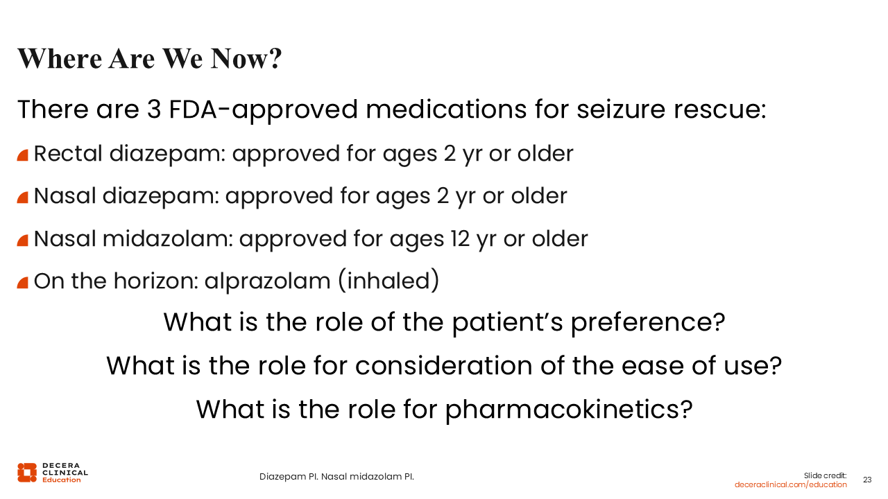 The first, which we have already mentioned, is rectal diazepam, which was approved by the FDA on July 29, 1997, as a rescue therapy for acute repetitive seizures. This approval allowed, for the first time, at-home administration of diazepam to control severe epileptic seizures by nonmedical caregivers, potentially avoiding ED visits in people 2 years of age or older.