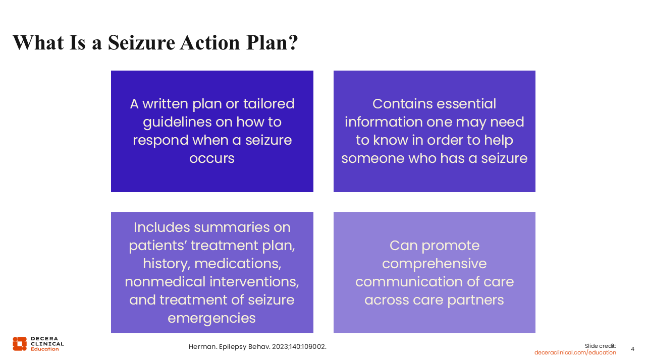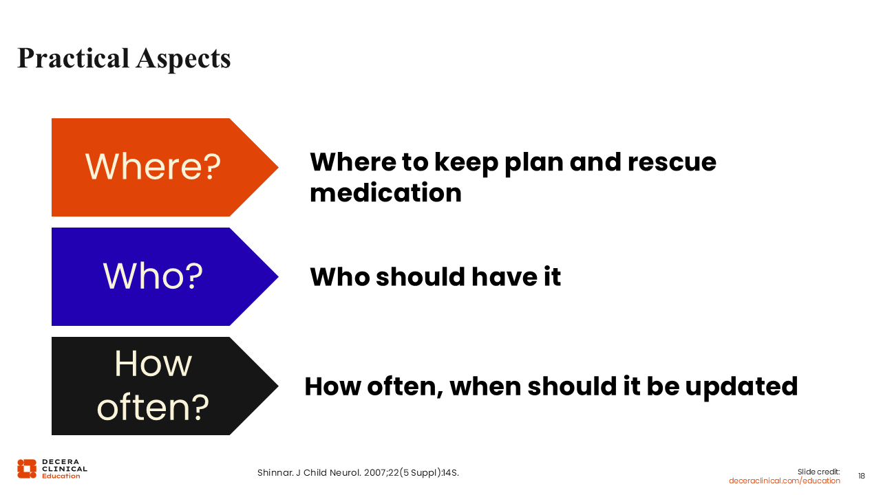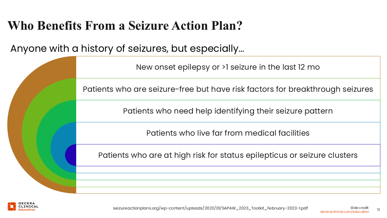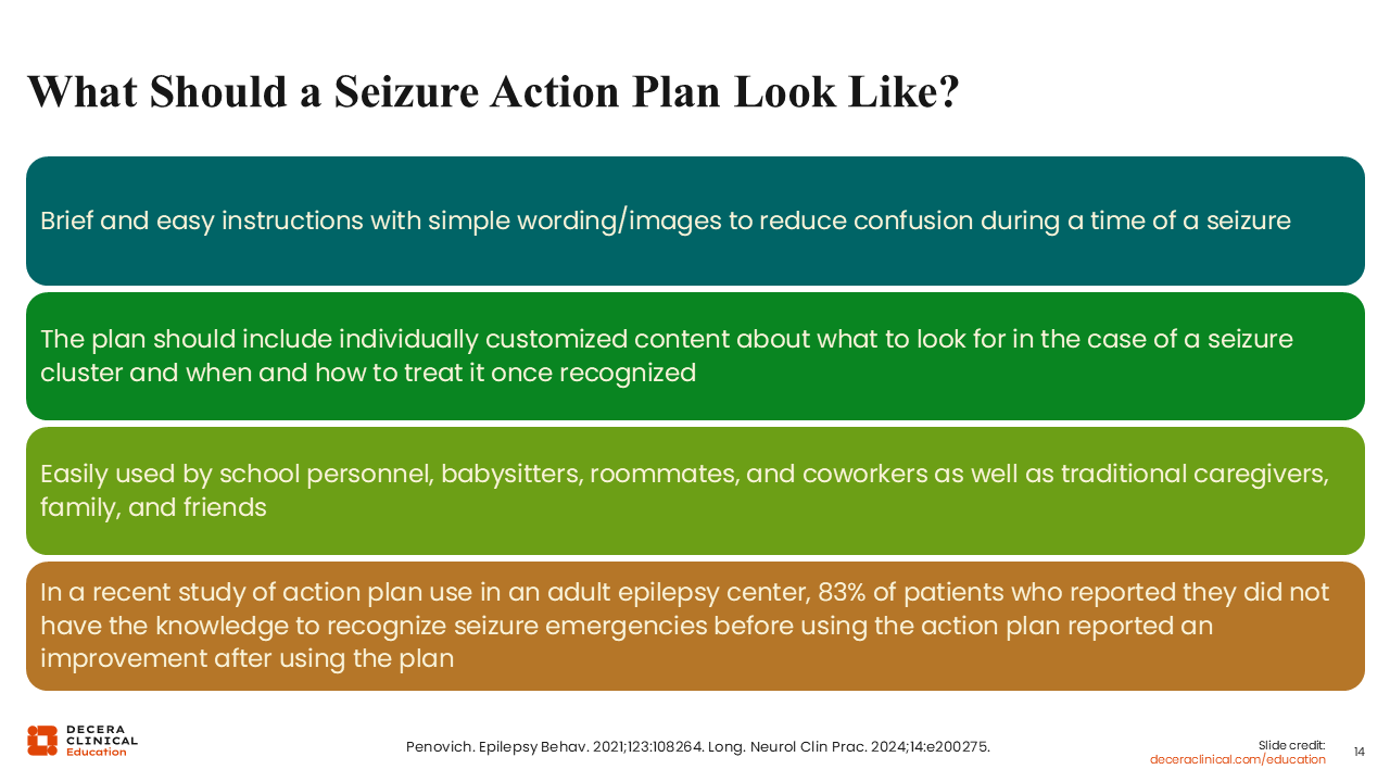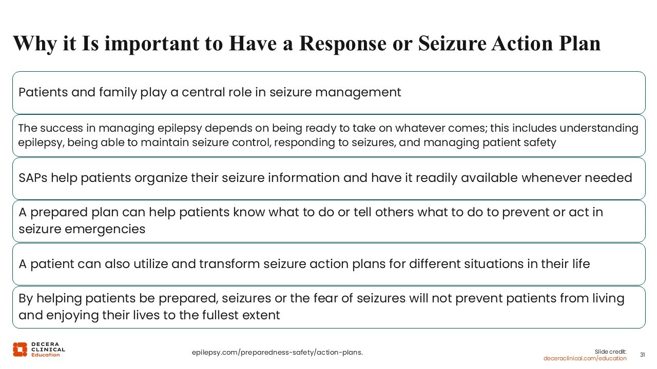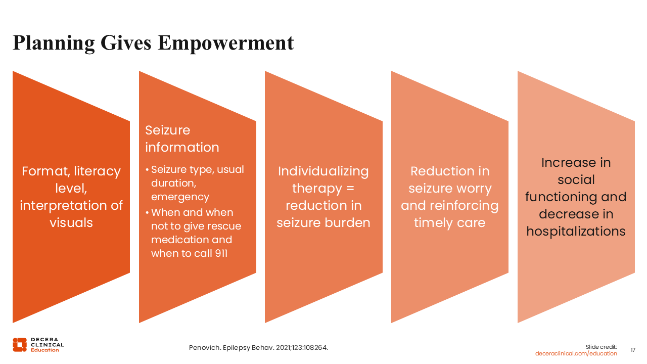 When you tell people what to do in an emergency and how to do it, it gives them a sense of empowerment. You want to ensure it is incorporated with an appropriate literacy level, guidance on interpreting visuals, and individualized information, such as seizure type, duration, emergency conditions, and when and when not to administer rescue medication or call 911. This individualization not only helps reduce seizure burden and anxiety but also supports timely care, improving social functioning and reducing hospitalization.