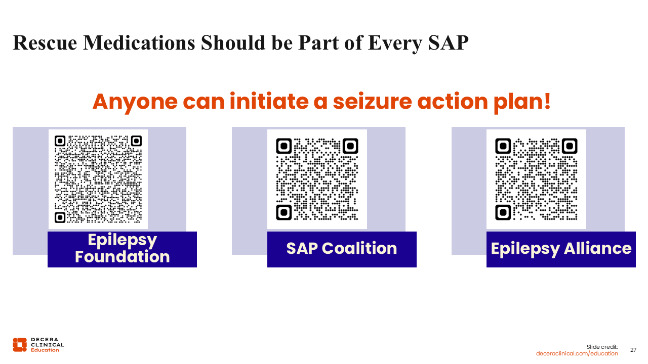 SAPs go hand in hand with the seizure rescue medications because in the action plan, you are telling them what to do in this emergency, that is, using an intervention like a seizure rescue medication to try to stop the seizure as soon as possible, preventing prolonged seizure,22 status epilepticus, accumulated cognitive/structural changes over time and, in turn, improving overall quality of life.