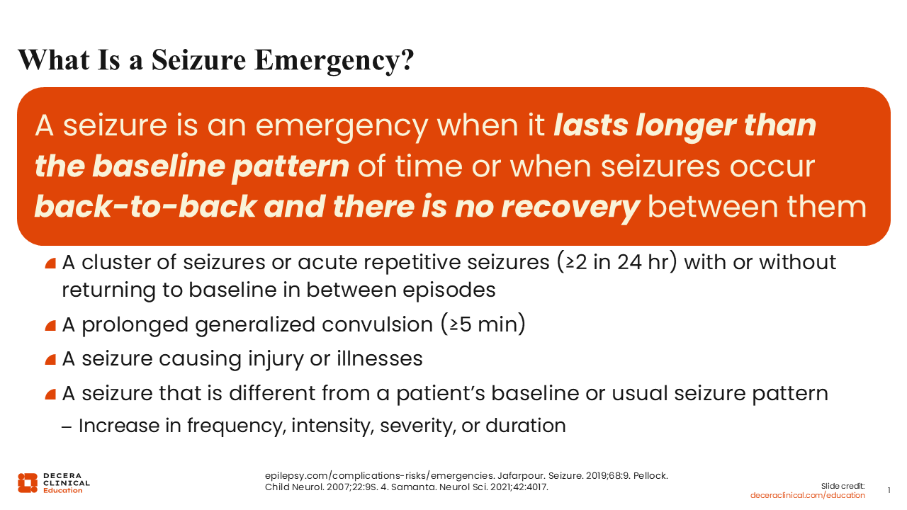 A seizure is considered an emergency when it lasts longer than the patient’s baseline pattern or when multiple seizures occur back to back, and there is no recovery in between them. Breaking it down further, we consider a seizure emergency a cluster of seizures or acute repetitive seizures with 2 or more seizures in 24 hours, with or without returning to baseline between them. We would also consider a prolonged generalized convulsion a seizure emergency.1,2