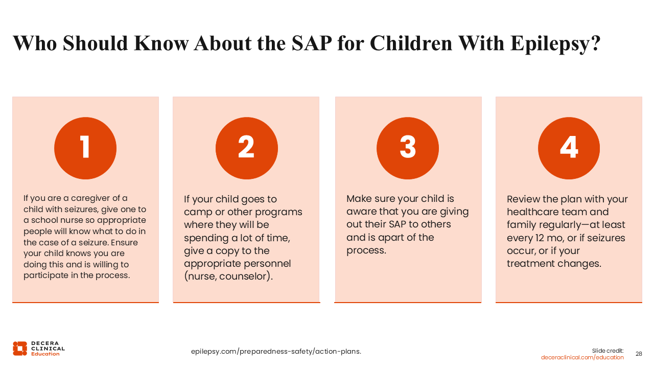 Who should know about the SAP for children with epilepsy? First is the caregivers because these are usually the ones administering rescue medication, especially at home and overnight. Second is the school nurse. Beyond that are other settings where the child spends time, such as after-school programs, summer camp settings, and even situations like a sleepover at a friend’s house. Finally, when developmentally appropriate, the child with epilepsy should also understand the SAP because that autonomy supports independence and helps them participate in their own care over time.
