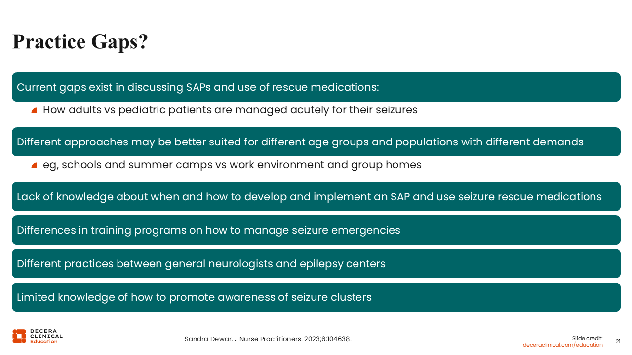 Examining practice gaps, we see deficiencies in discussing SAPs and the use of seizure rescue medications. For example, how are adult vs pediatric patients with epilepsy managed acutely for their seizures? There are various approaches that may be better suited to different age groups and different populations with different demands.