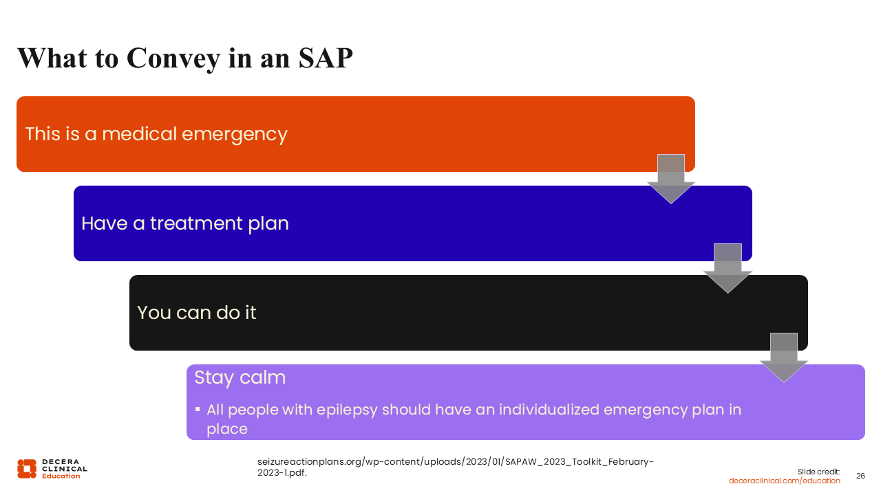 What should an SAP look like? First, it should be brief, concise, and easy to follow. Ideally, it would include simple wording and pictures because we are trying to reduce confusion during a time of stress. The plan should include individualized content on what would be recognized as a seizure emergency or a seizure cluster for that patient, and what to do when such events occur.17 Once it is recognized, it should be easy for school personnel, babysitters, roommates, coworkers, caregivers, family, and friends to use.