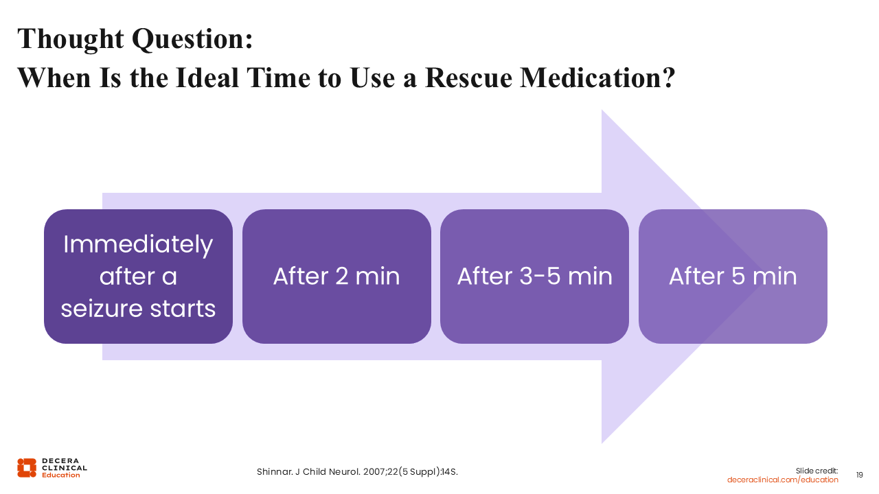 Even though status epilepticus may have a definition of a seizure lasting 5 minutes or longer, that does not mean that is when the rescue medication should be given. These are 2 different questions, although they are clearly linked.23 Some people may say immediately after a seizure starts. Some people may provide a time-based definition, such as after 2 minutes, 3-5 minutes, or 5 minutes, and there is considerable variability in how HCPs may counsel their patients.