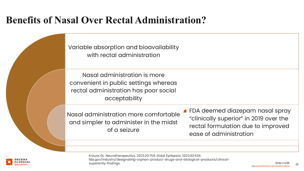 Nasal administration is also more convenient, particularly in public settings where rectal administration may have poor social acceptability, and it is more comfortable and simpler to administer during a seizure. This can be especially important for patients who may have a larger body habitus, may have physical limitations like cerebral palsy or contractures, or may also be predominantly using a wheelchair for mobility where it becomes more difficult for a caregiver to put them in a proper position on their side on a flat surface to administer a rectal medication. All these factors led the FDA to deem intranasal diazepam clinically superior to the rectal formulation when it was approved in 2019.