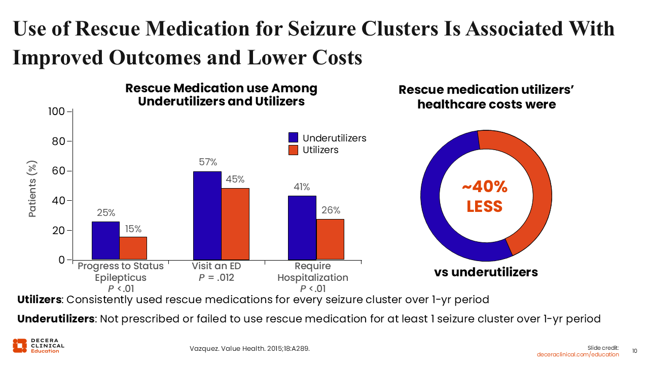In seizure clusters, the use of rescue medications further supports their association with improved outcomes and lower healthcare related costs. In a study by Vasquez and colleagues11 comparing rescue medications between utilizers (who consistently used rescue medications for every seizure cluster over a year) and underutilizers (who were not prescribed or failed to use rescue medications), underutilizers had a greater percentage of status epilepticus, ED visits, and need for hospitalization. In addition, a 12-month healthcare cost analysis showed that rescue medication users had 40% lower healthcare costs compared with underutilizers.