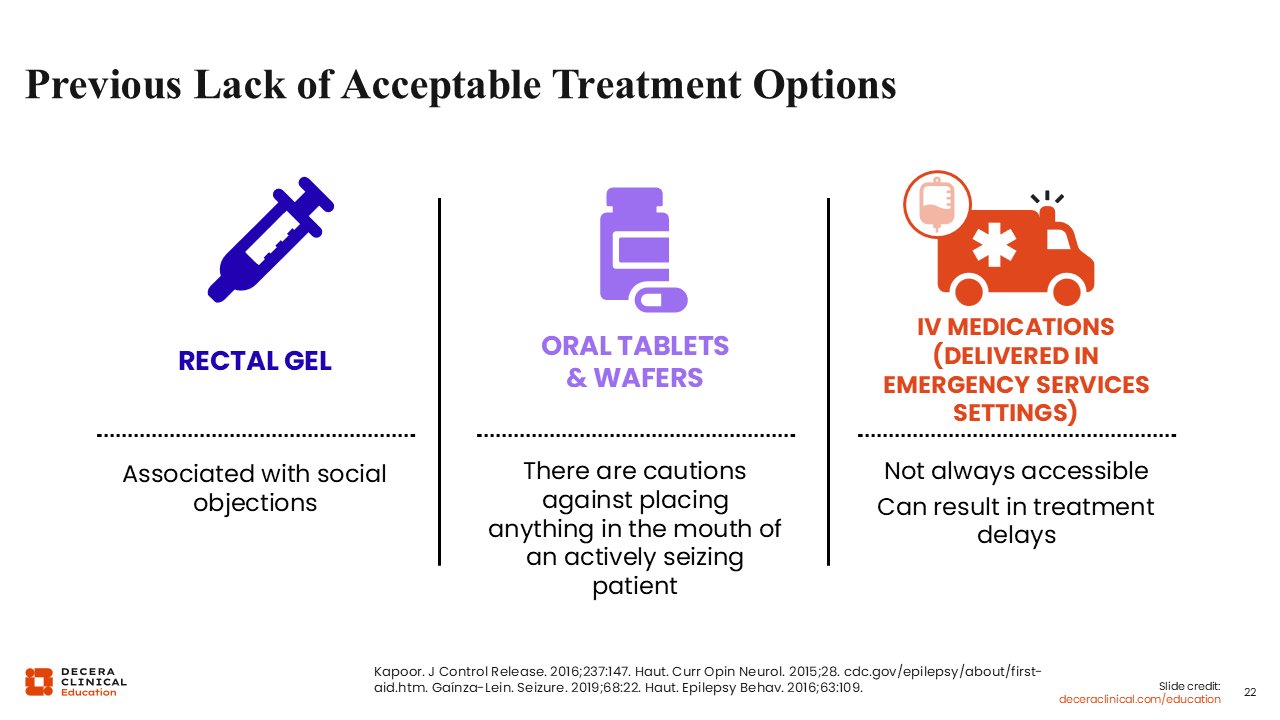 In addition, prior to 2019 and 2020, the only FDA-approved rescue medication was rectal diazepam, which was not always socially amenable to many of our patients and caregivers or feasible to give.4 For instance, if a person with epilepsy is of a body size where their caregiver is unable to position them properly to give something rectally, then it becomes physically difficult, if not impossible, to administer an emergency medication, even if it is available.