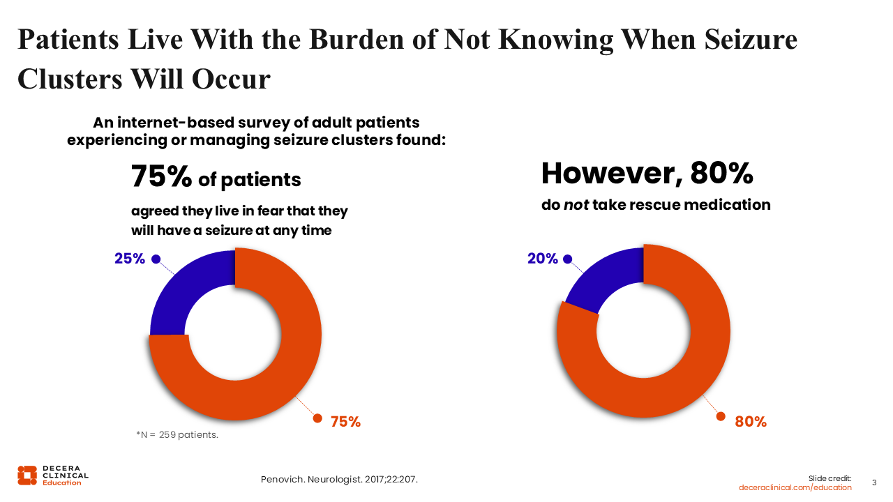 In a study done by Penovich and colleagues,10 an internet-based survey of adult patients experiencing or managing seizure clusters, 75% of patients agreed that they live in fear of having a seizure at any time. As mentioned previously, this goes hand in hand with an increased emotional burden that affects quality of life. However, despite this fear, the survey showed that 80% of patients did not take rescue medication, suggesting a disconnect.