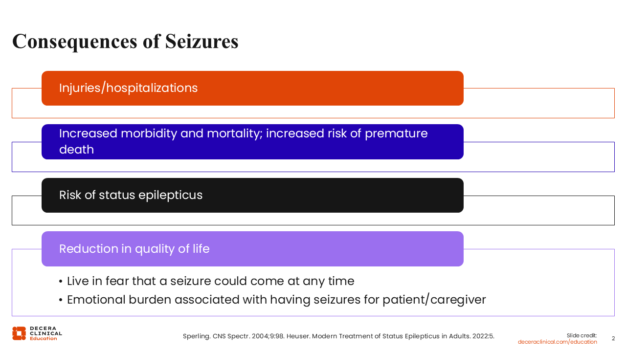Regarding injuries, these can include head injuries from falls with a seizure, which can further compound neurologic outcomes and neurocognitive function and potentially increase the risk of other seizures.8