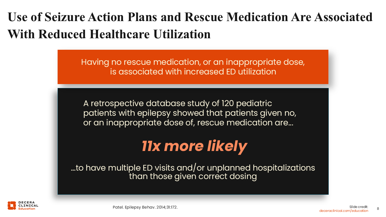 We know that the use of SAPs and rescue medications are associated with reduced healthcare utilization and that having no rescue medication or having an inappropriately dosed rescue medication is associated with increased ED utilization. A retrospective study of 120 pediatric patients with epilepsy showed that patients who were given either no rescue medication or an inappropriate dose of rescue medication were 11 times more likely to have multiple ED visits and/or unplanned hospitalizations than those given correct dosing.14