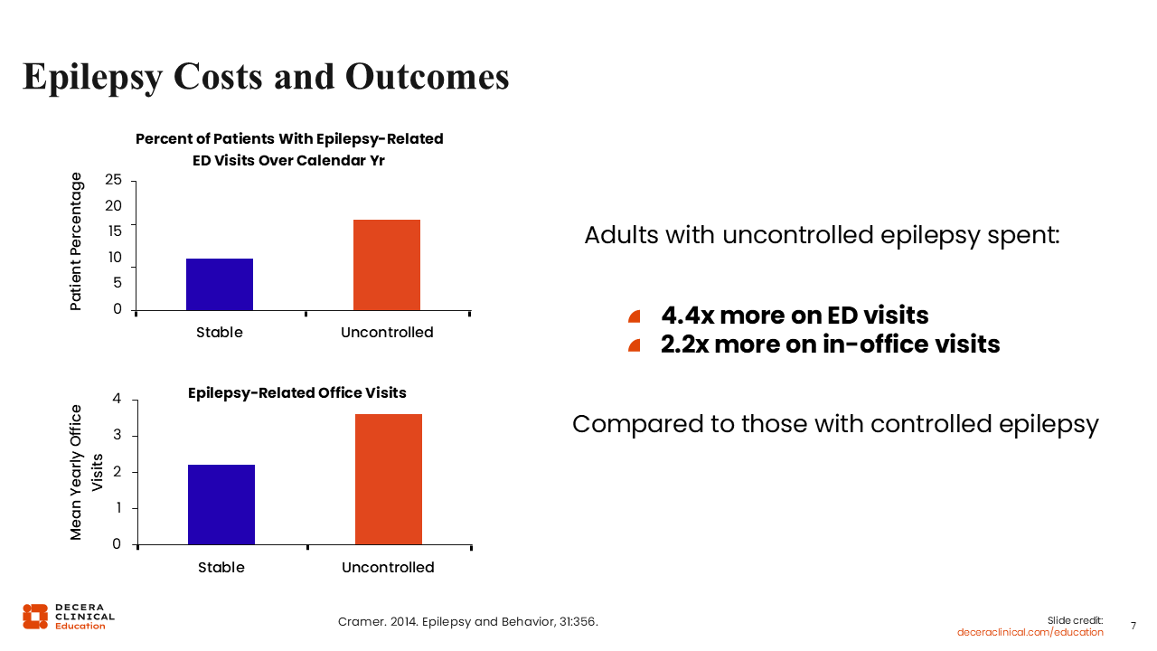 This study by Cramer and colleagues9 highlighted epilepsy costs and outcomes by comparing the percentage of patients with uncontrolled vs well-controlled seizures who had epilepsy-related ED visits during a calendar year as well as epilepsy-related office visits. The study showed that those people with epilepsy who have uncontrolled seizures have 4.4 times more epilepsy-related ED visits and 2.2 times more epilepsy-related office visits compared with those who have controlled epilepsy.