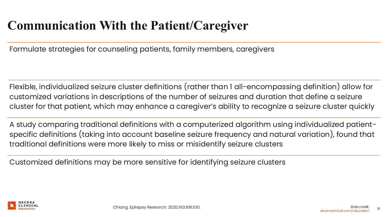 Finally, probably the most important aspect when we communicate with our patients is to define the typical seizure characteristics for each patient. Patients should know their baseline seizure patterns and presentations. We then have a discussion to help them to determine what would be different or unusual compared with their typical seizure baseline or pattern. For example, if someone has a focal aware seizure and recovers quickly with no alteration in awareness, we would not necessarily consider that an emergency or recommend the use of a seizure rescue medication. But if the patient never has focal impaired awareness seizures or focal to bilateral tonic-clonic seizures and starts having either of those, then that would be different than baseline and would be considered a seizure emergency and warrant intervention.
