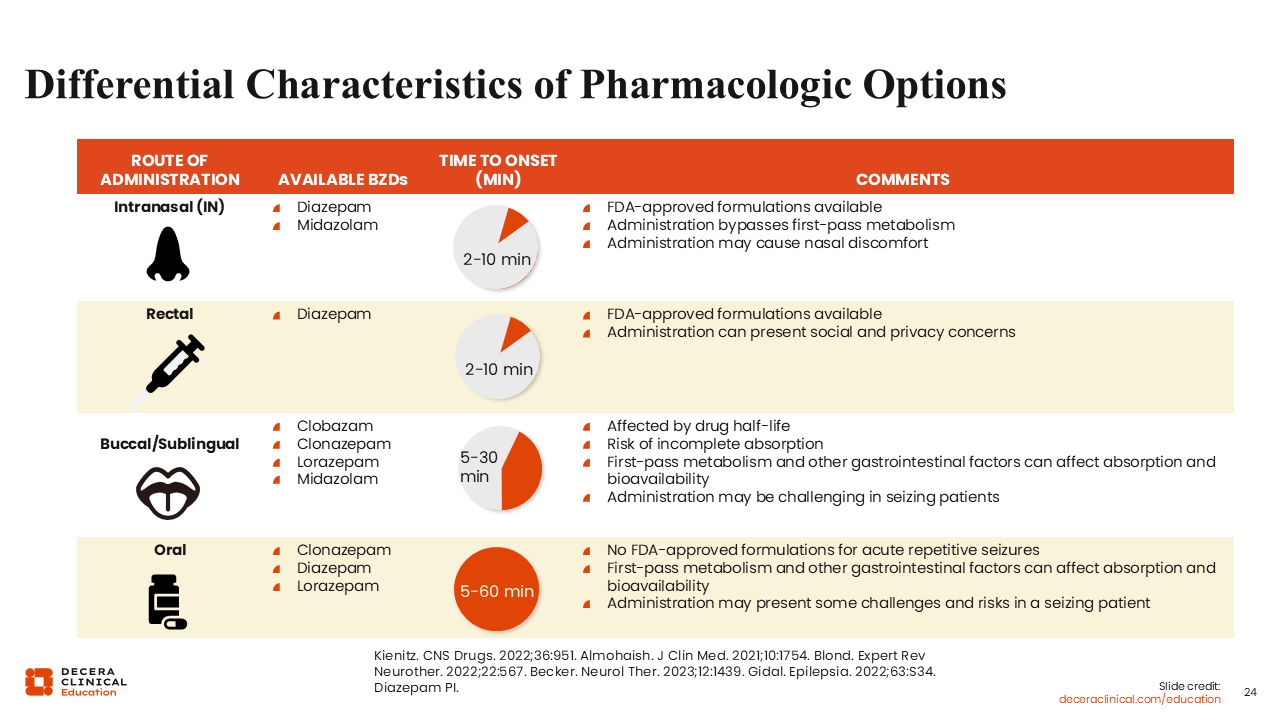 The second route is rectal, with the only currently approved molecule being rectal diazepam, and its onset is 2-10 minutes. In addition, in this case, there is variability in absorption, and there are social and privacy concerns about that route of administration.
