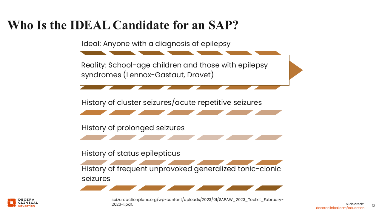 Certainly, anybody who has a history of cluster seizures or acute repetitive seizures should have an SAP. Anybody with a history of prolonged seizures or status epilepticus absolutely should have one in place. Someone who has frequent, unprovoked generalized tonic-clonic seizures should as well.