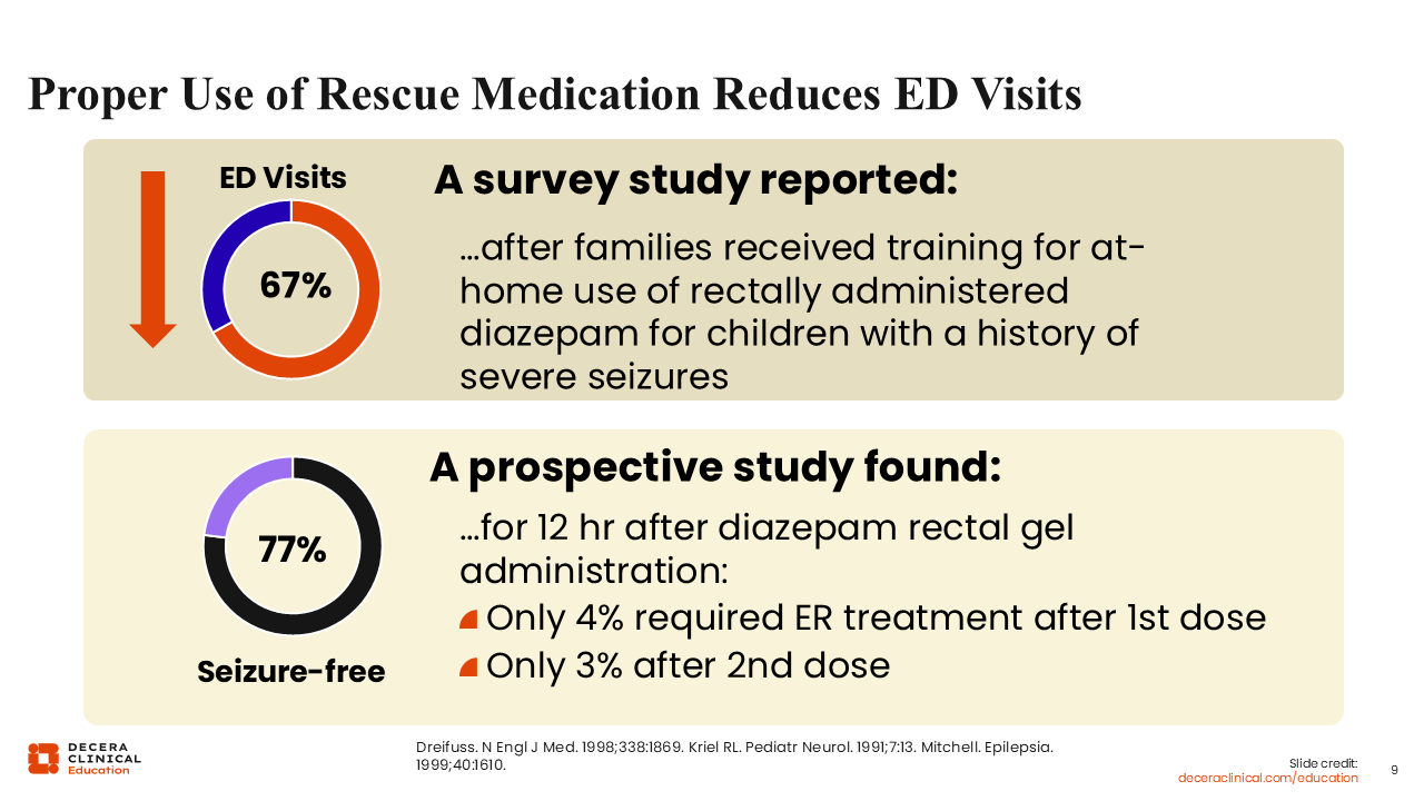 Further supporting that the proper use of rescue medication reduces ED visits, a survey showed that after families received training for at-home use of rectal diazepam for children with a history of severe seizures, their ED visits were reduced by 67%.12