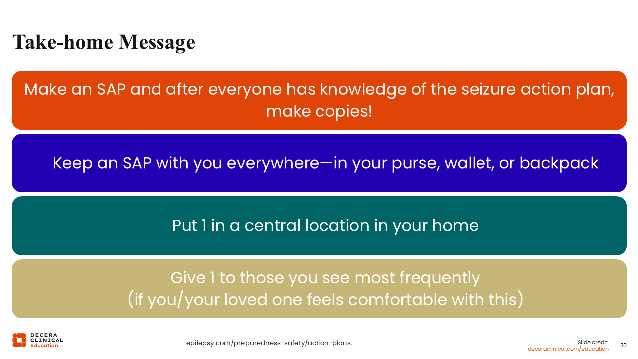 A key takeaway is to think ahead about where the SAP and rescue medication will be stored. That decision depends on the person and their routine. For some people, especially those who can still respond at the very beginning of a seizure, it may make sense to keep the SAP and medication with them so they can self-administer when appropriate. For others, it is more important that the plan be placed where others can access it quickly.