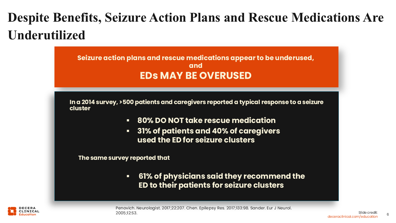 In one survey of more than 500 people with epilepsy and their caregivers about their typical response in the setting of a seizure cluster, up to 80% did not take rescue medication, and 31% of patients and 40% of caregivers ended up relying on the ED for those seizure clusters.10