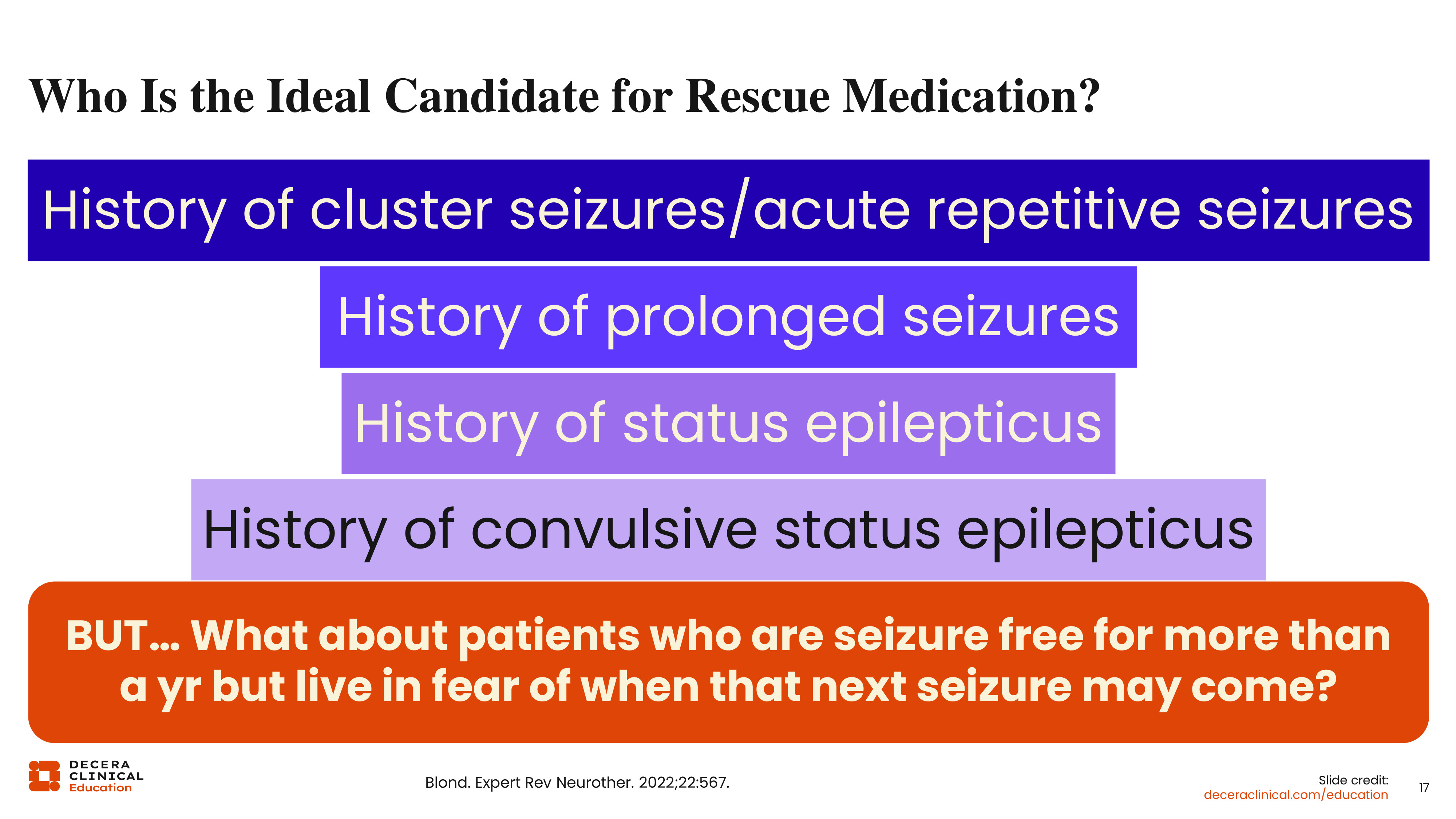 We discussed who the ideal candidate is for an SAP, and that goes hand in hand with who is the ideal candidate for a rescue medication: anyone who has a history of seizure clusters, acute repetitive seizures, prolonged seizures, seizures different than their baseline pattern, or status epilepticus, especially convulsive status epilepticus. But what about those patients who are seizure free for over a year, but live in fear of when that next seizure could start at any time?