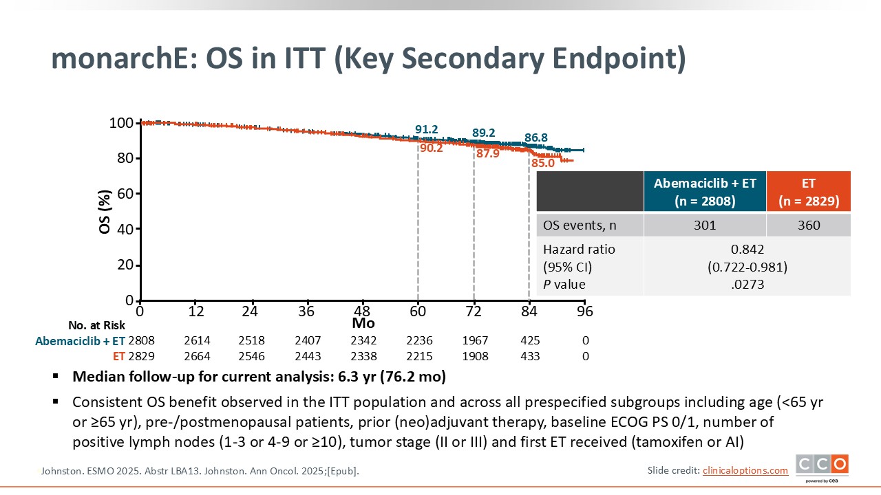 With a median follow-up of 6.3 years, for the first time we see an OS benefit with adjuvant abemaciclib that is statistically significant with a hazard ratio of 0.842.14,15 I think that this is clinically meaningful and it is what we may expect from a clinical trial in the adjuvant setting. I think that we will see that this benefit could be even higher with a longer follow-up. Adjuvant abemaciclib plus ET is definitely something that we have to discuss and offer the patients who fulfill the criteria of the trial given the statistically significant OS benefit for this specific population.