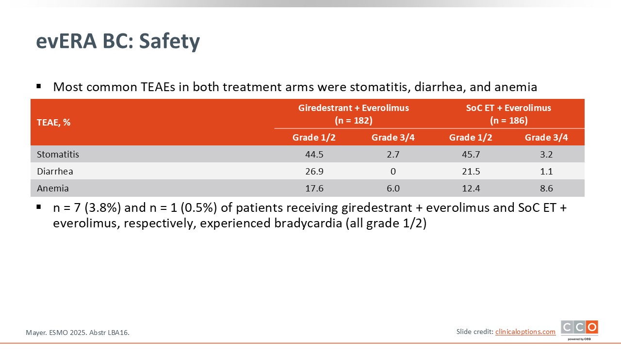 I think these are some of the most promising data we have in the second-line setting post CDK4/6 plus ET therapy. They clearly show that combination treatment can be beneficial even in the control arm with ET plus everolimus. The combination resulted in a median PFS of more than 5 months, but the PFS was even higher with giredestrant plus everolimus, demonstrating this is a very active combination.