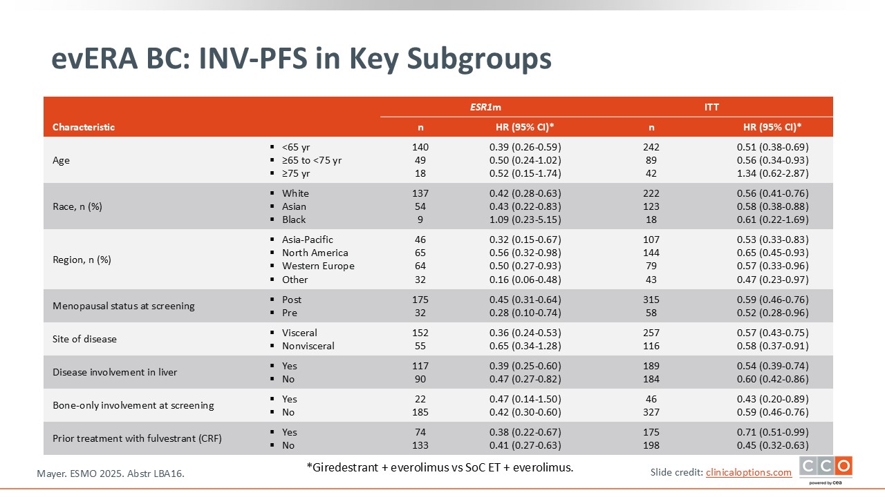 There are other SERDs under development and although some have regulatory approval for patients with ESR1 mutations, this is the first trial using an oral SERD in combination with everolimus. In the EMBER-3 trial, a combination of imlunestrant plus abemaciclib improved PFS vs standard ET regardless of ESR1 mutation status.11 Recently, imlunestrant was approved by the FDA as monotherapy for the treatment of adults with ER-positive, HER2-negative, ESR1-mutated advanced or metastatic breast cancer with disease progression following at least 1 line of ET.12 If this combination is approved based on the ITT data, this is another combination that we could use without biomarker selection. Of note, the patient populations in evERA BC and EMBER-3 were quite different, but in each trial the median PFS improvement was significant for those particular populations.