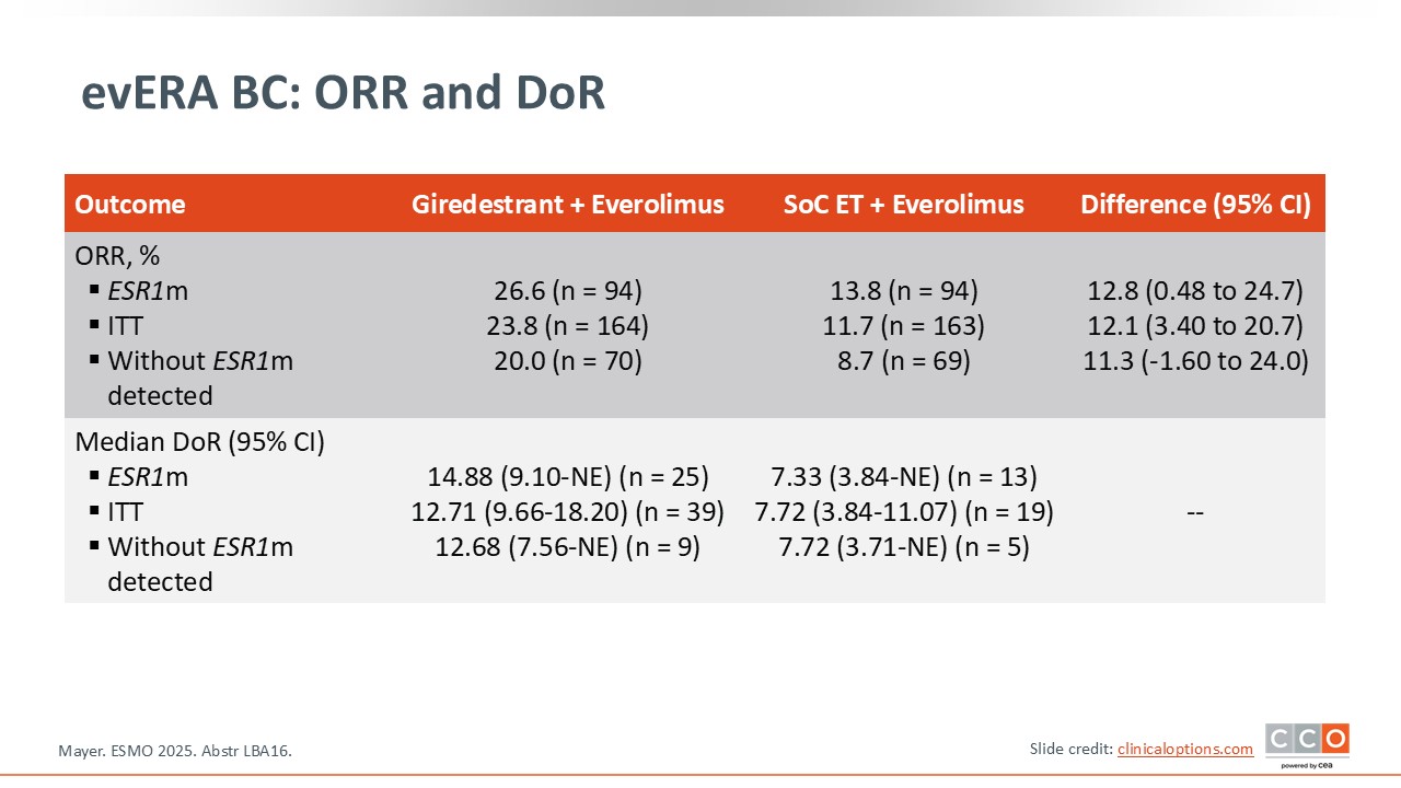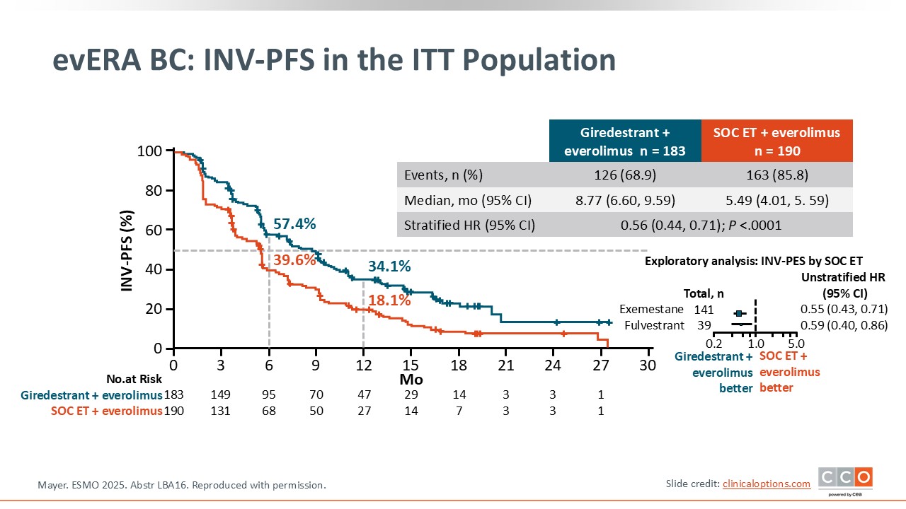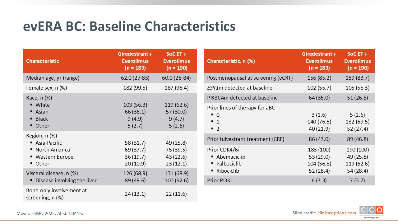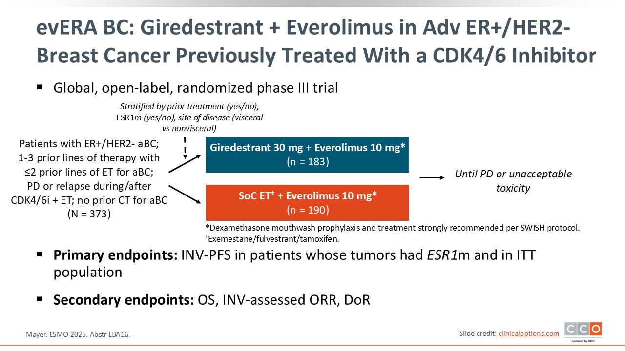 The phase III evERA BC trial compares the oral selective estrogen receptor degrader (SERD) giredestrant plus everolimus to SoC ET plus everolimus in patients with previously treated ER-positive/HER2-negative advanced breast cancer.8 This trial builds on previous trials, in particular BOLERO-2, that demonstrated that everolimus combined with ET can be beneficial in patients previously exposed to ET, leading to the approval of exemestane plus everolimus.9 Patients on the evERA BC trial must have experienced progression on ET and CDK4/6 inhibitors but received no prior chemotherapy. The primary endpoint of the trial was investigator-assessed PFS in patients with tumors harboring ESR1 mutations with a coprimary endpoint of investigator-assessed PFS in the intention-to-treat (ITT) population.