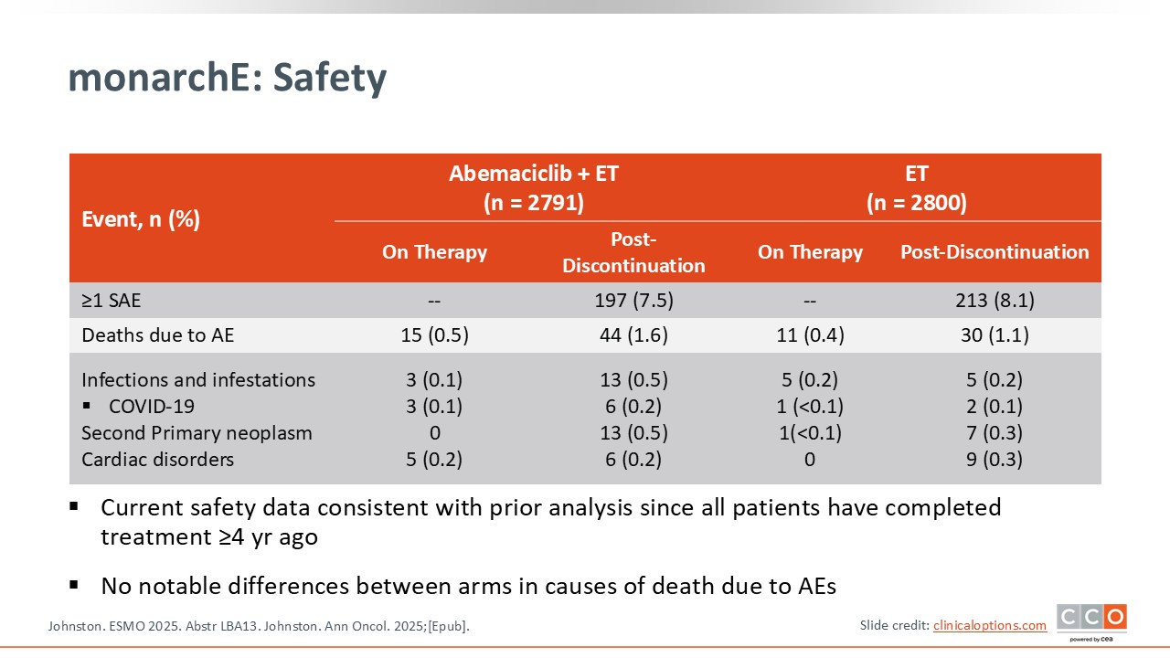Of importance are the characteristics of the patients eligible to enroll on the monarchE trial. This included patients with at least 4 positive nodes or 1-3 positive nodes and grade 3 or greater pathology findings or large tumors of 5 cm or more. There were a small number of patients included in cohort 2 with 1-3 axillary lymph nodes and a Ki-67 score of more than 20%. Unlike the NATALEE trial of adjuvant ribociclib, no patients with node-negative disease were included in this trial.18 Also of note is that abemaciclib is given twice daily for 2 years. Physician’s choice of ET included tamoxifen, aromatase inhibitors, and GnRH analogues but by contrast NATALEE excluded tamoxifen. This is a benefit of the monarchE trial because we know that some patients cannot tolerate the AEs associated with aromatase inhibitors.