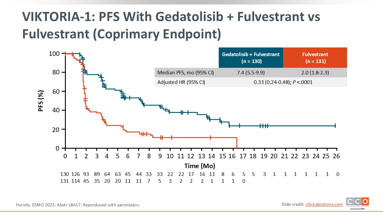 The phase III VIKTORIA-1 trial asked if the addition of gedatolisib, a pan-PI3k/mTOR/AKT inhibitor, improved PFS when added to second-line fulvestrant or fulvestrant plus palbociclib.13 VIKTORIA-1 had 2 cohorts, 1 for patients with PIK3CA wild-type disease and another for patients with PIK3CA-mutant disease. The results presented at ESMO were for the cohort with PIK3CA wild-type disease. Patients were randomized to either fulvestrant, fulvestrant plus gedatolisib, or triplet therapy with fulvestrant, palbociclib, and gedatolisib.