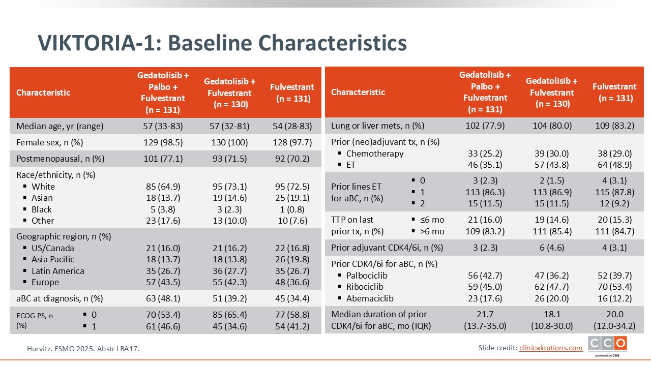 It is important to point out some similarities and differences between the patient populations in the previous trial, evERA BC, and VIKTORIA-1.8,13 Both trials included patients pretreated with CDK4/6 inhibitors with a maximum of 2 lines of prior ET and no previous chemotherapy. However, since gedatolisib can lead to hyperglycemia, VIKTORIA-1 did not enroll patients with type 1 diabetes or with type 2 diabetes and a hemoglobin A1C greater than 6.4%. Patients also had to have measurable disease by RECIST 1.1, which means a higher-risk population in VIKTORIA-1 compared to evERA.