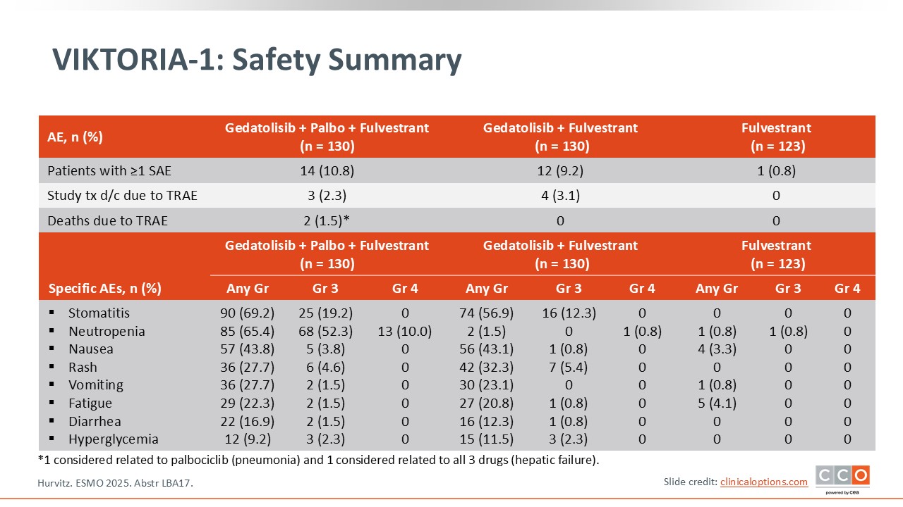 VIKTORIA-1 will bring a highly active doublet or triplet, depending on approval, to the clinic for patients with pretreated HR-positive metastatic breast cancer but there are some caveats.13 First, it is still not clear whether you really need the palbociclib, because both the triplet and doublet combinations appear quite active. Second, the IV infusion administration of gedatolisib could raise some challenges in this population that is usually treated without infusions. We know that having an oral regimen is advantageous in terms of logistics and patient preference. There seems to be more toxicity, especially with the triplet compared to that observed in evERA BC8 and with other options available in this setting. I believe that this combination will be helpful in the clinic and there may be patients who benefit from it, but I do think it comes with some challenges for use in clinical practice.