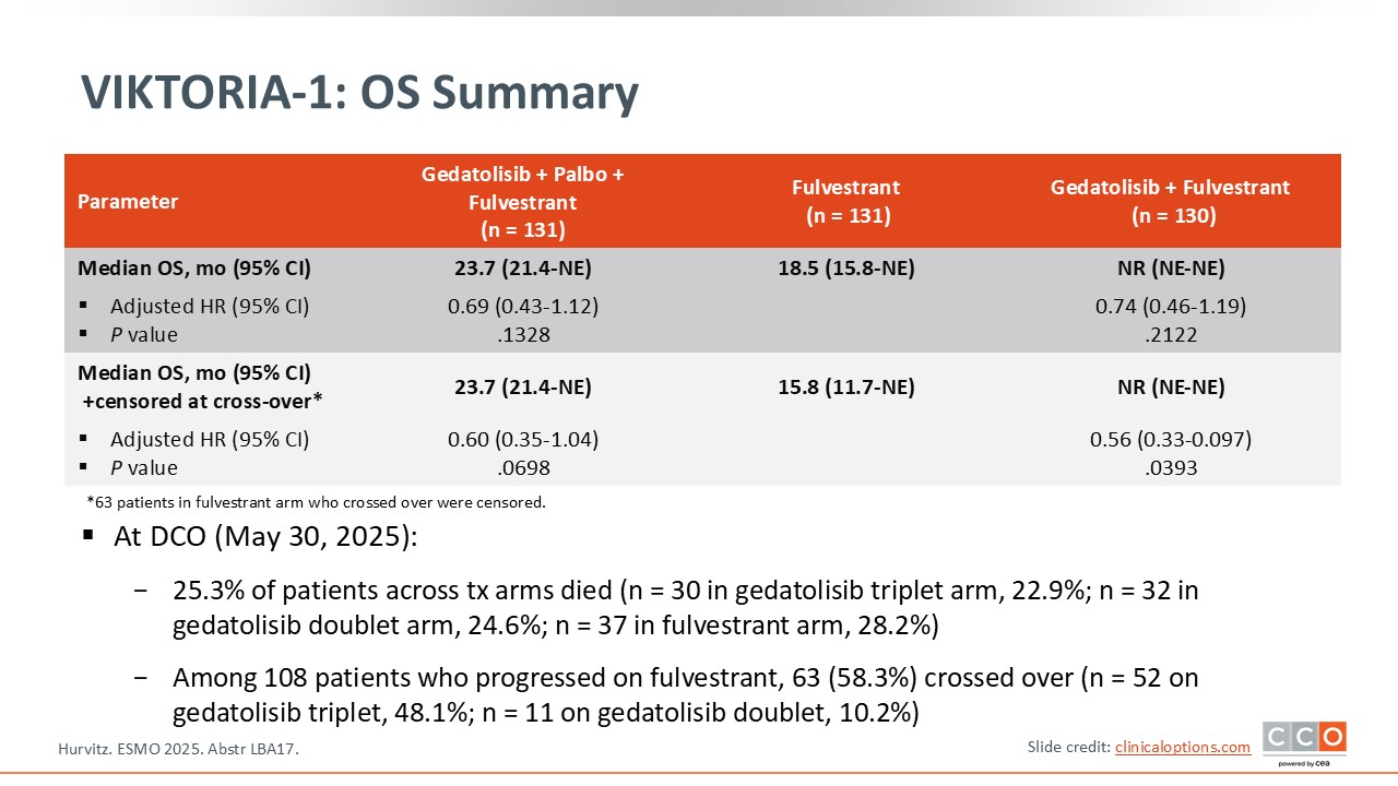 There was a favorable trend in OS in both gedatolisib treatment arms.13 Of note, this trial had a built-in crossover option allowing patients who progressed on fulvestrant to receive 1 of the 2 gedatolisib regimens.