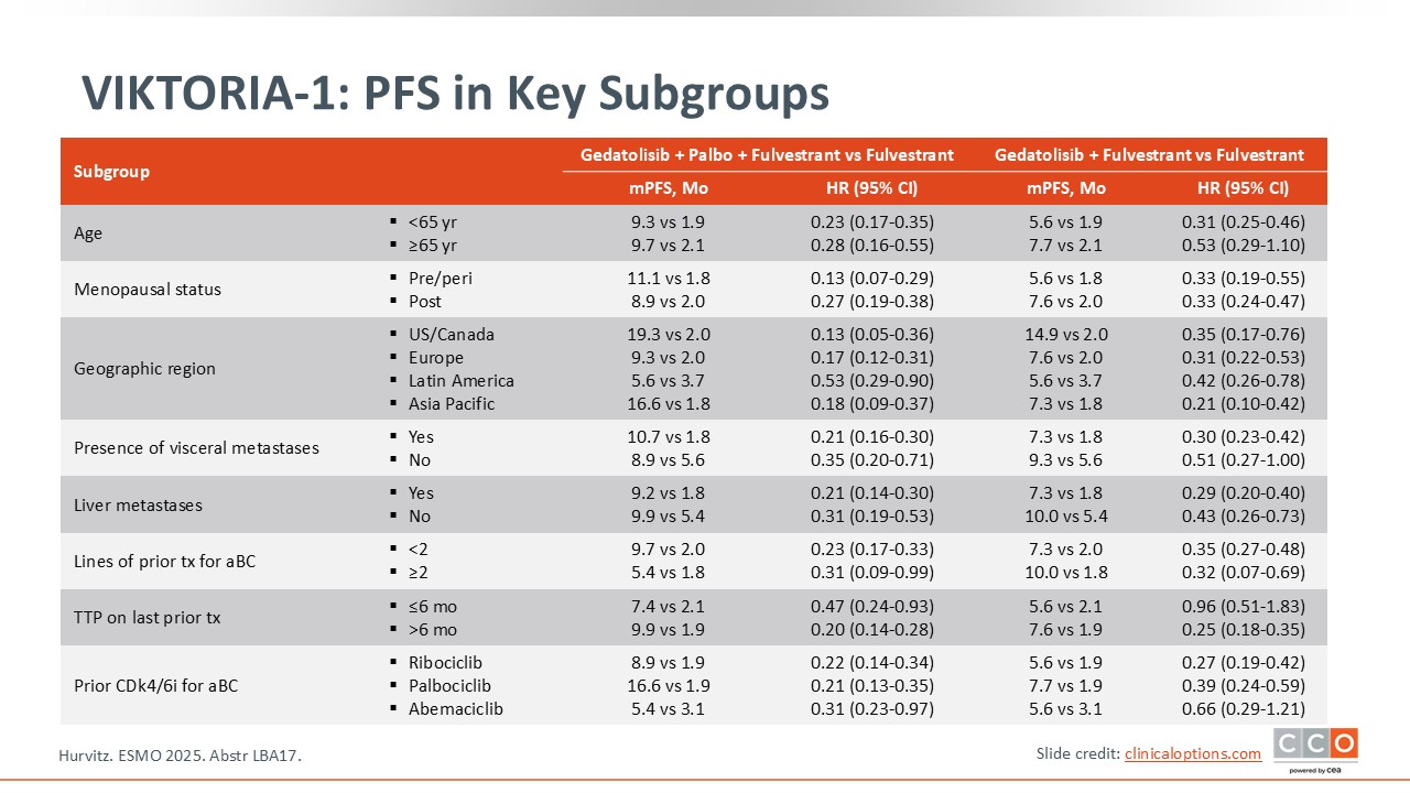 The VICTORIA-1 trial is quite difficult for me to translate into clinical practice because the data presented are only for the PI3K wild-type population, which is less interesting. Although PFS was increased with gedatolisib in both combinations compared with fulvestrant, I would note that monotherapy is not a standard anymore in this specific scenario. Although gedatolisib demonstrates good efficacy and safety, I think the main limitation of gedatolisib is that it is an IV drug given weekly every 3 out of 4 weeks. One of the main advantages of treating patients in the endocrine sensitive–setting is the ability to prescribe oral treatments that prevent the patients from having to come to the hospital frequently without a lot of blood tests and renal function tests. For patients in this setting who may be treated with gedatolisib, you need to use the IV formulation of the drug. In my opinion, it is difficult to envision a future for this drug given that other agents in this setting such as PI3K/AKT/mTOR pathway inhibitors can be administered orally.