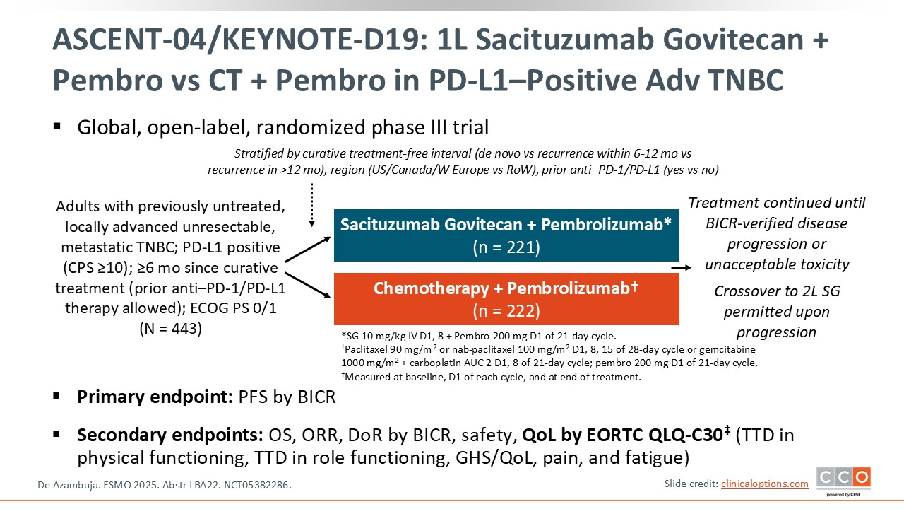 ASCENT-04/KEYNOTE-D19: First-line Sacituzumab Govitecan + Pembrolizumab vs CT + Pembrolizumab in PD-L1–Positive Advanced TNBC