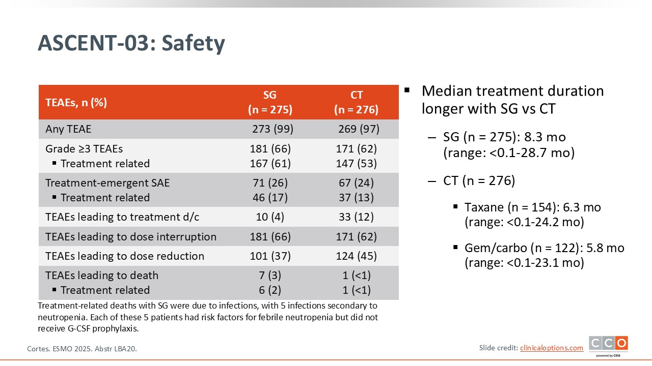 It is important to note that even with a longer duration of treatment with sacituzumab govitecan, the grade 3 or higher treatment-related AEs are very similar between both arms.25,26 There were more discontinuations and dose reductions with chemotherapy.