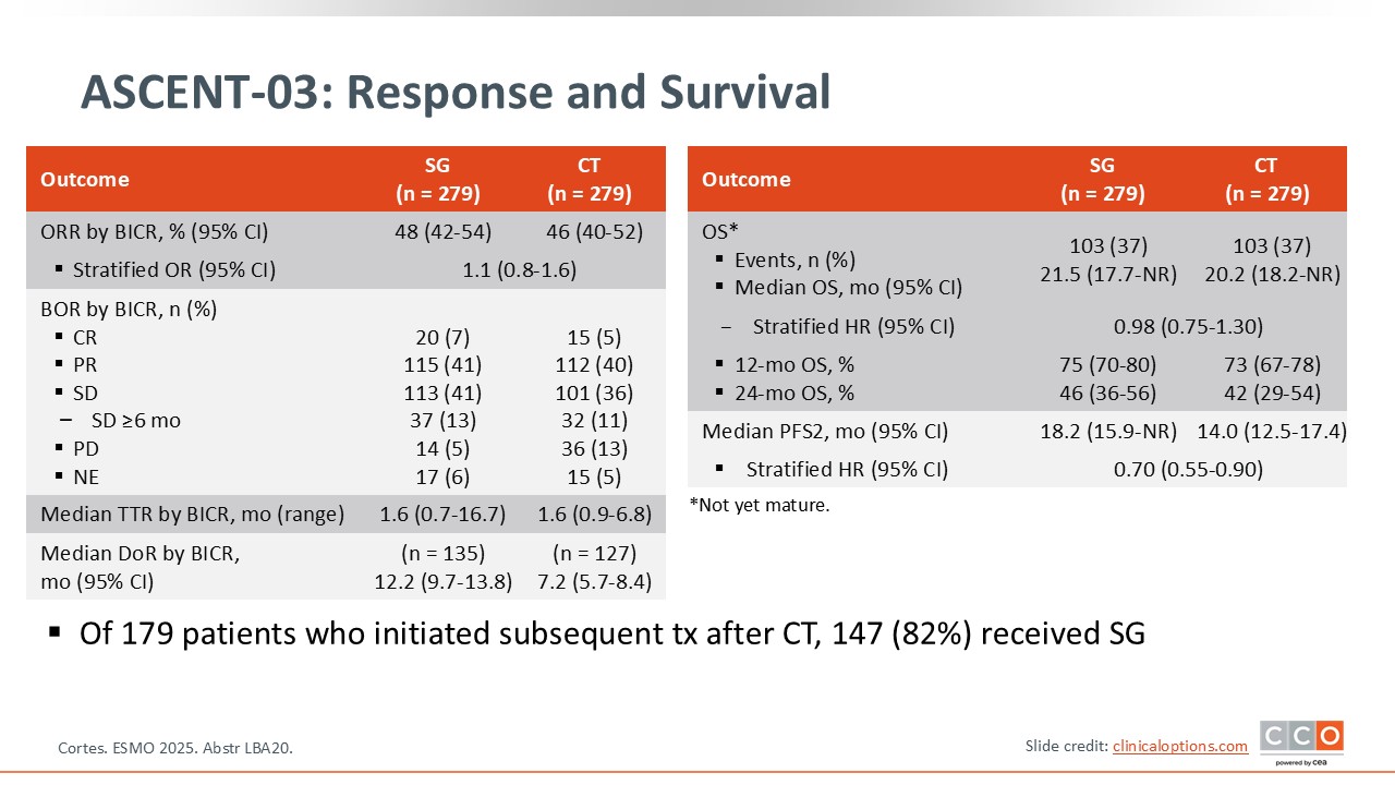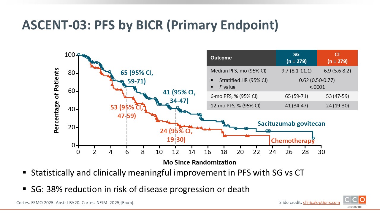 The primary endpoint of ASCENT-03 is PFS by BICR.25,26 The results are very clear with a statistically significant improvement in median PFS from 6.9 months with chemotherapy to 9.7 months with sacituzumab govitecan. The hazard ratio was 0.62. I agree with the authors that this is clinically meaningful for this specific patient population.