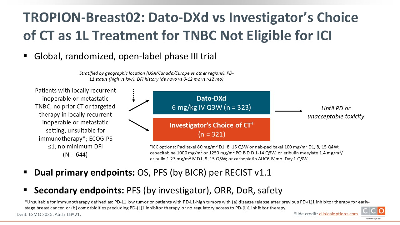 TROPION-Breast02: Dato-DXd vs Investigator’s Choice of CT as First-line Treatment for TNBC Not Eligible for Immune Checkpoint Inhibitors
