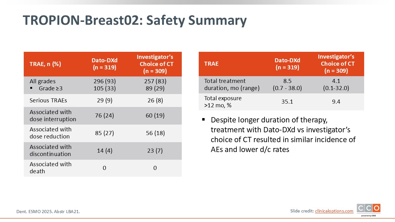The rate of grade 3 or higher AEs is similar in both arms with no increase in toxicity with a longer treatment duration for Dato-DXd.27 Dose interruptions and reductions were higher with Dato-DXd but the rate of treatment discontinuation is similar.